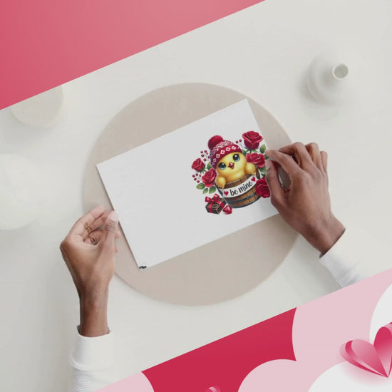 Diese zauberhafte Valentinskarte versprüht pure Herzenswärme. Das niedliche gelbe Küken mit roter Wintermütze schaut fröhlich aus einem Holzfass, umgeben von roten Rosen, kleinen Herzen und einem liebevoll verpackten Geschenk. Der Schriftzug „Be mine“ macht die Botschaft klar, herzlich und voller Zuneigung.