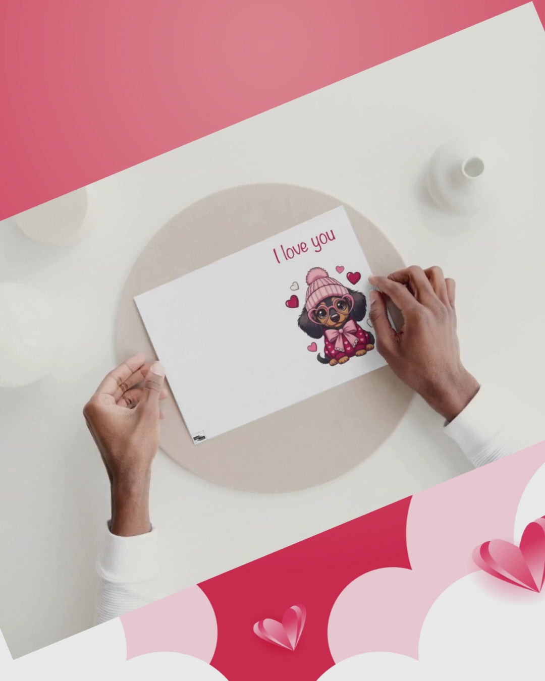 Diese liebevoll gestaltete Valentinskarte mit süßem Hund ist eine herzerwärmende Art, „Ich liebe dich“ zu sagen. Der niedliche Hund mit rosa Mütze, Schleife und herzförmiger Brille wird von kleinen Herzen umgeben und trägt die klare Botschaft „I love you“. Das verspielte Design in sanften Rosa- und Rottönen wirkt besonders liebevoll und modern.