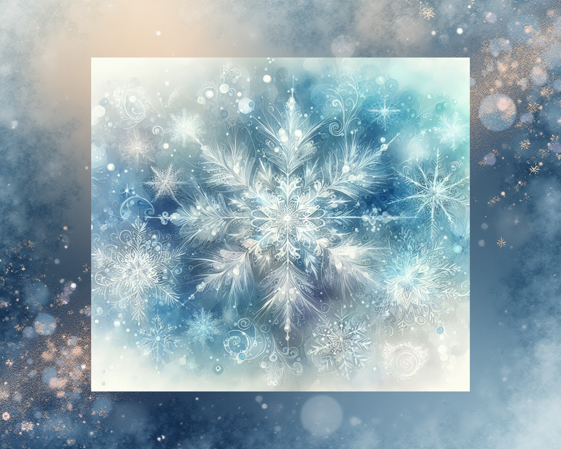 Feine, detailreiche Schneeflocken wirbeln auf einem kühlen, bläulichen Hintergrund und erinnern an gefrorene Fensterscheiben im Morgenlicht. Das Design strahlt Ruhe, Reinheit und winterliche Eleganz aus – minimalistisch und gleichzeitig faszinierend.